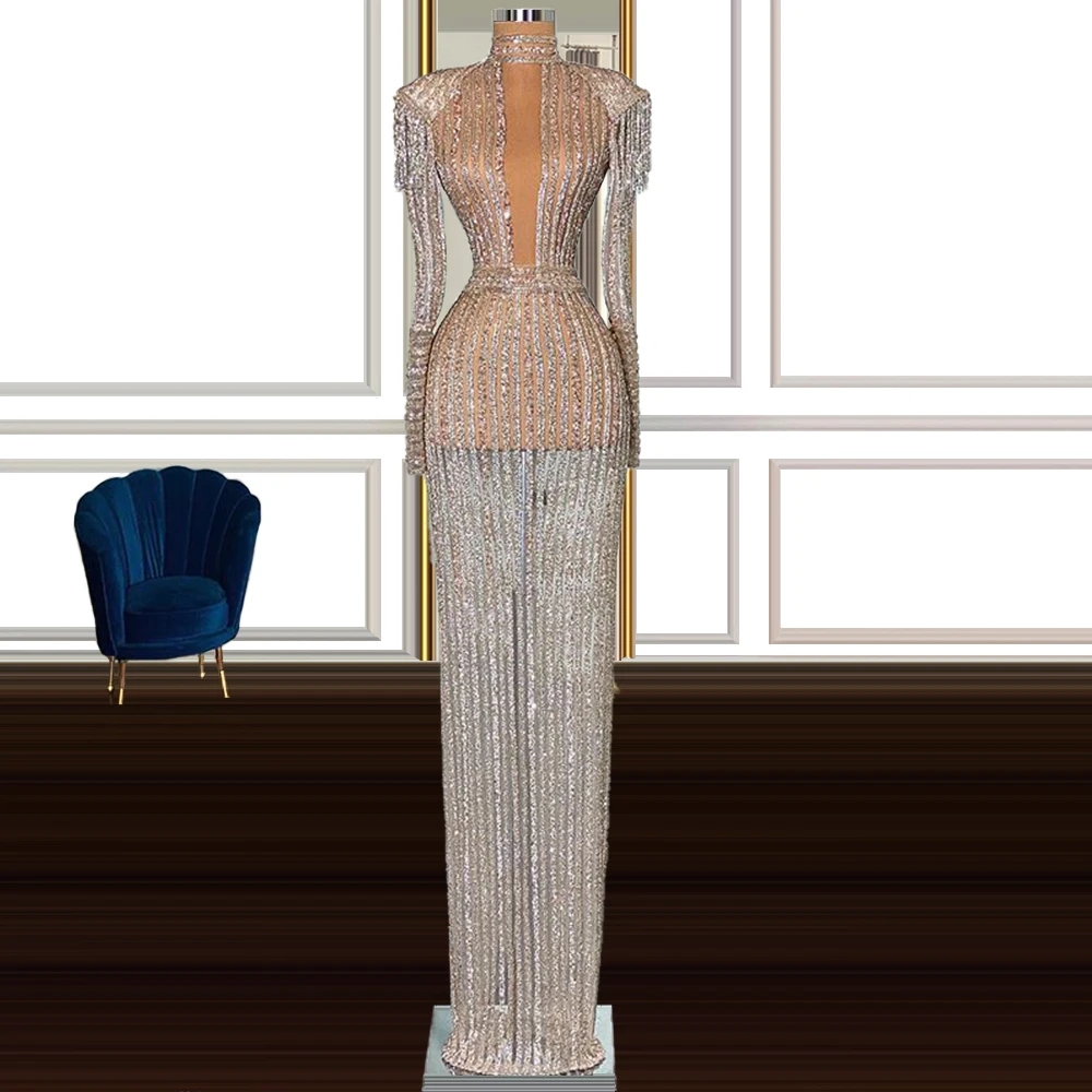 Glitter Long Sleeves Prom Dresses High Neck Tassels Dubai Wedding Party Dress robe anniversaire femme
