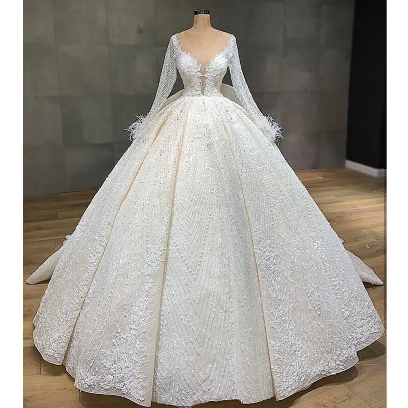 Addition Information of Vestidos De Novia Illusion Long Sleeve Ball Gown Wedding Dress Luxury Beading Appliques Wedding Gowns Ruffles Back Bride Dress