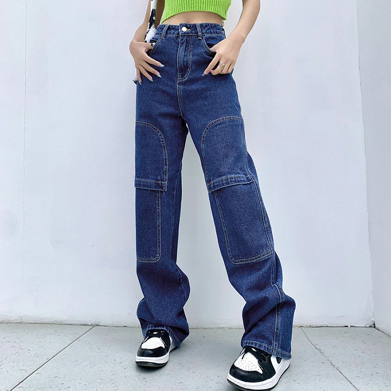 AIIOU Loose Long Pants Fashion Vintage Street Style Women Wide Leg Jeans Placket with Zipper Pocket Casual Femme Pantalon