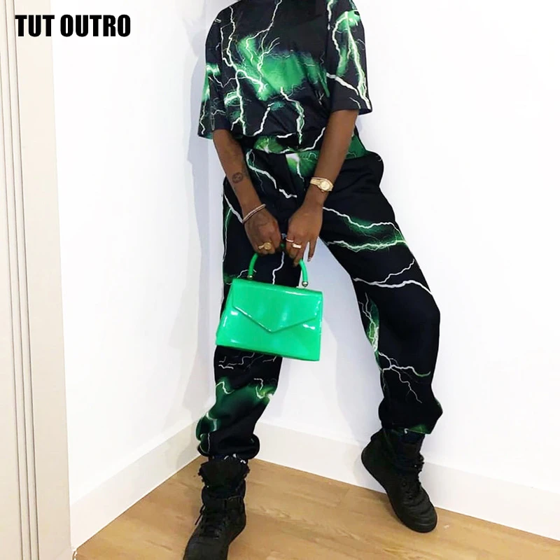 Autumn Green Lightning Print Hip Hop Harem Pants Women Cargo Pants Casual Safari Style High Waist Women Joggers Sweatpants