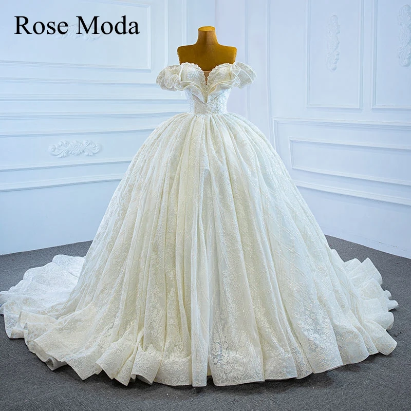 Related Product for and Rose Moda Luxury Off Shoulder Glittering Lace Wedding Dress with Long Train Princess Ball Gown Custom Make