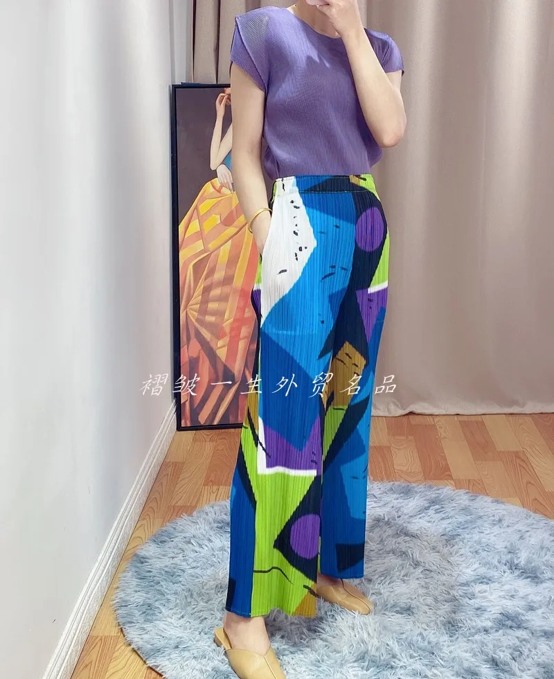HOT SELLING miyake Multicolor print pleated straight pants lenghth pants IN STOCK