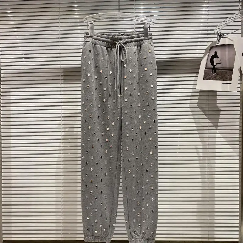 Addition Information of 2021 Spring New Full Leg Rivet Women Sweat Pants Drawstring Elastic Waist Loose Gray Pants