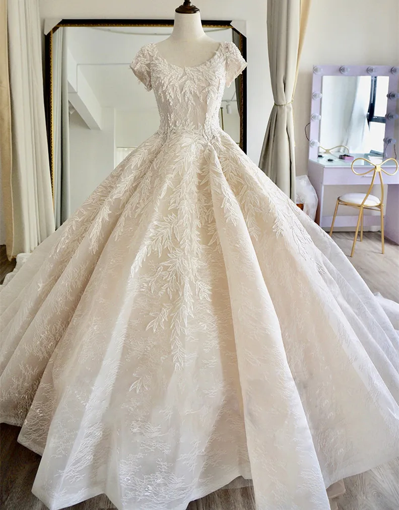 QUEEN BRIDAL Real Photo Ball Gown Short Sleeve Big Train Lace Beaded Flowers Wedding Dresses Luxury Custom Made 2021 New SA08