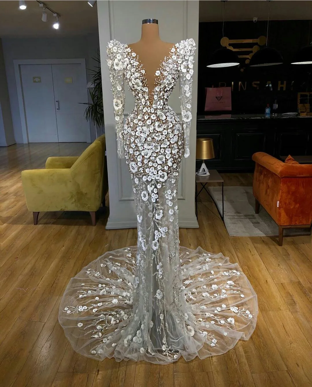 Addition Information of Luxury Beaded 2021 Mermaid Prom Dresses African Deep V Neck Long Sleeves 3D Flower Lace Evening Dress Formal Party Pageant Gowns