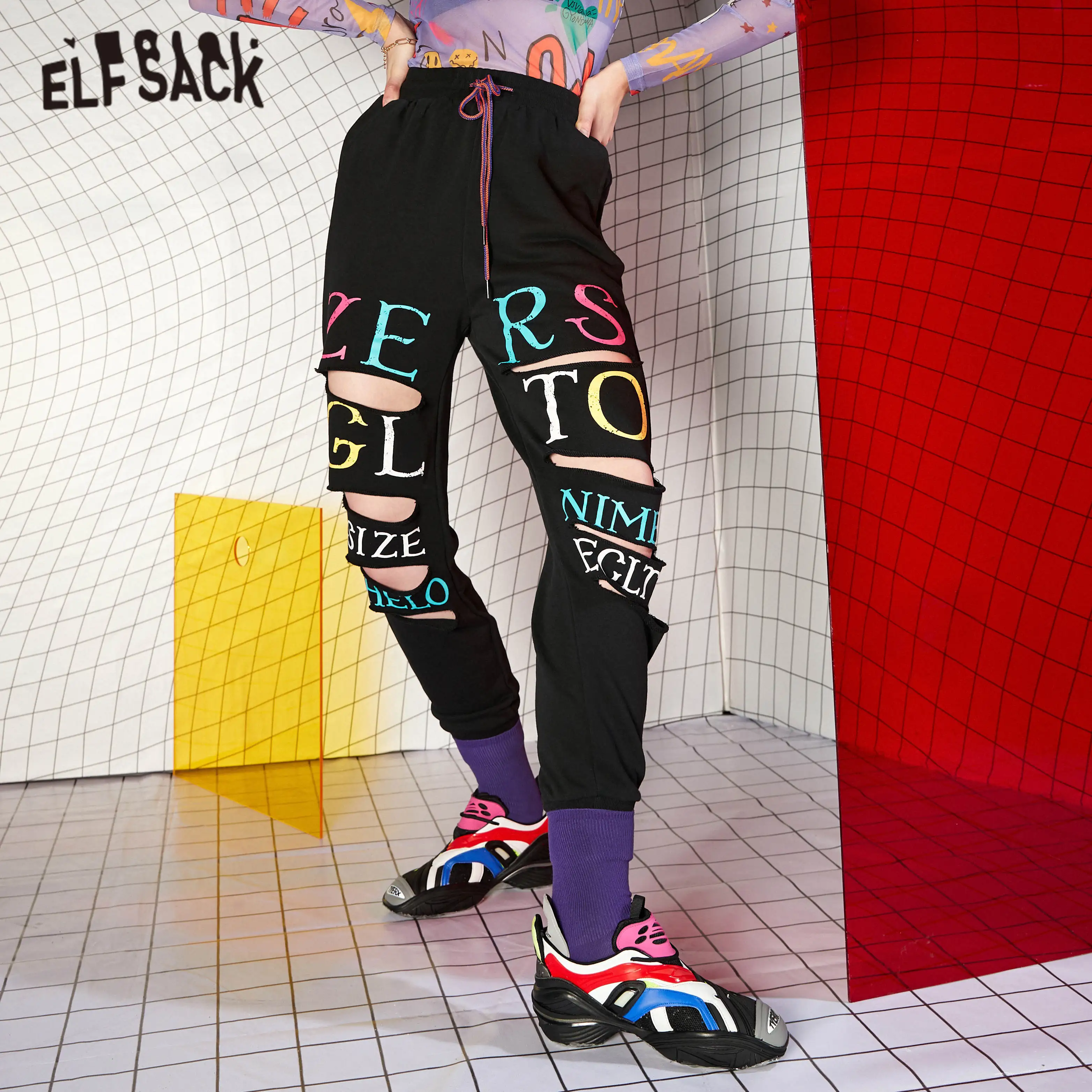ELFSACK Black Letter Print Straight Casual Women Pants 2020 Autunmn ELF Elastic Waist Ripped Hole Korean Ladies Daily Trouser