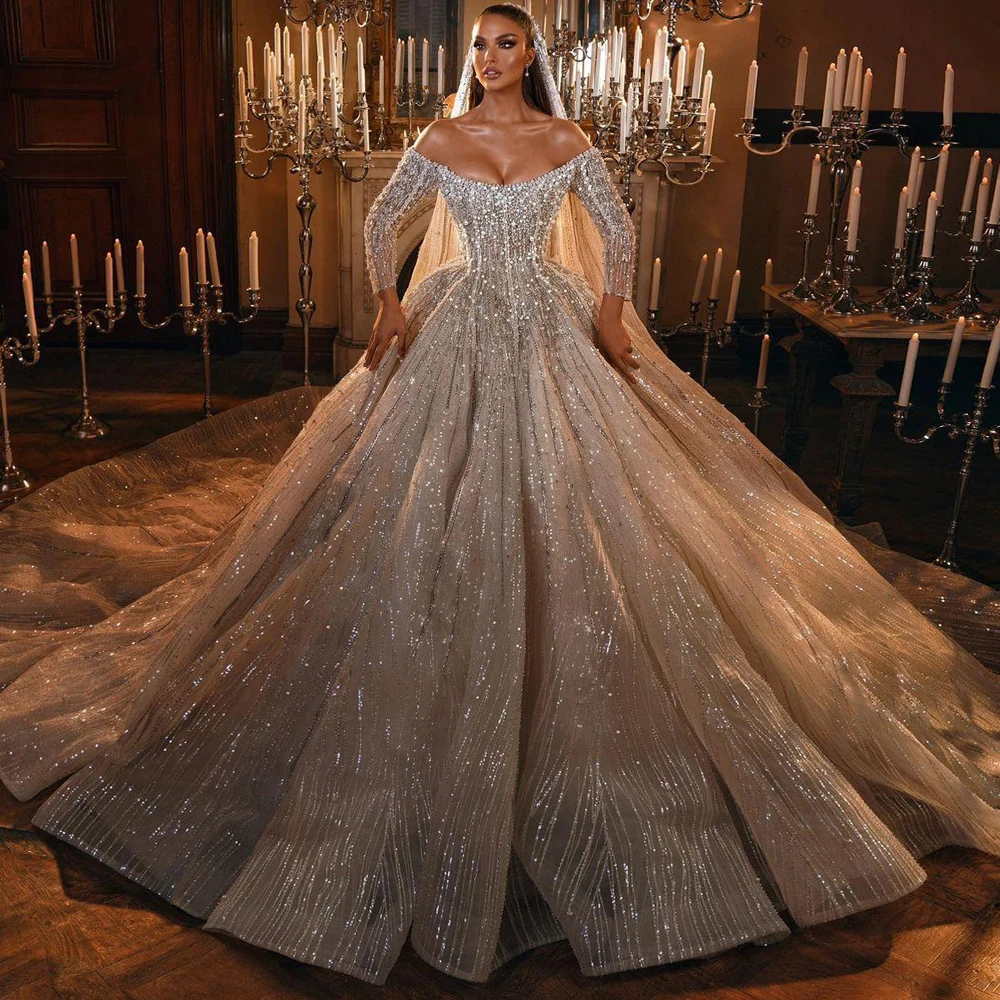 New Luxury Pearls Wedding Dresses A-Line Long Sleeves Sequins Shiny Wedding Gowns Unique Chapel Bridal Gowns Robe De Mariage