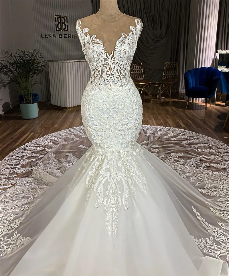 Addition Information of Romantic Lace Mermaid Wedding Dress With Cathedral Train Sexy Sheer O Neck Zipper Back Wedding Gowns Robe De Mariee