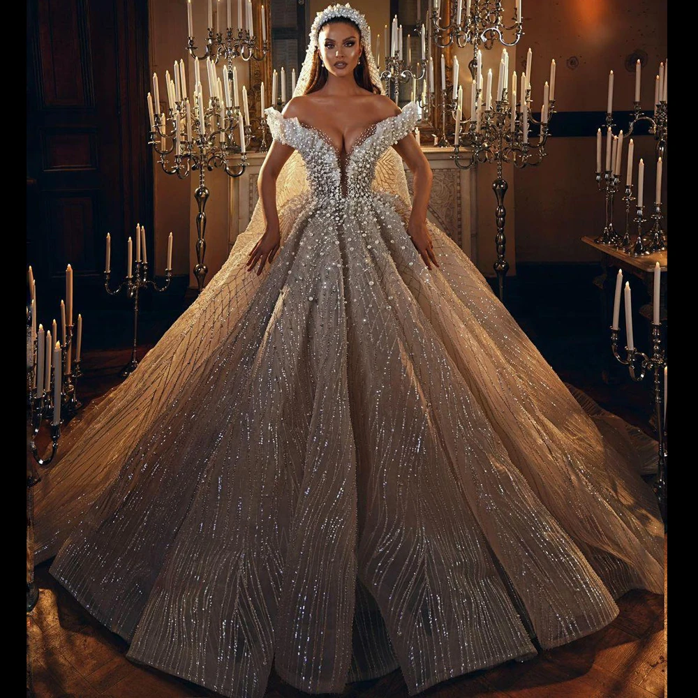 Gorgeous Pearls Wedding Dresses 2021 Champagne Sequins Sparkly Wedding Gowns Middle East Chapel Wedding Vestidos De Novia