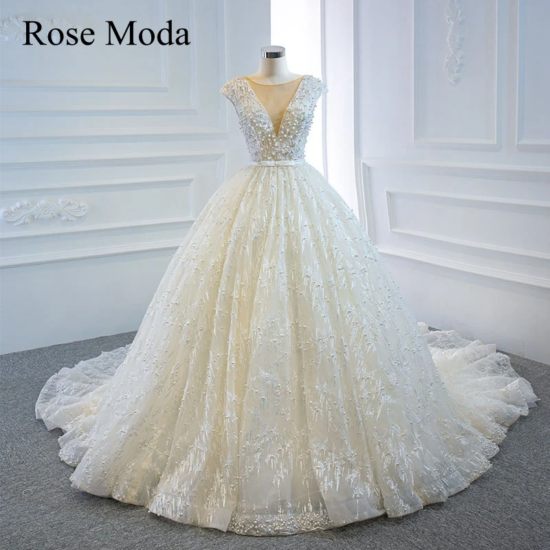 Buy Rose Moda Luxury Illusion Deep V Neck Pearl Beaded Lace Wedding Dress with Long Train Princess Ball Gown and You will Save USD 0 or 0%, Because You Just Pay for 649.00 not Full Price for 649.00