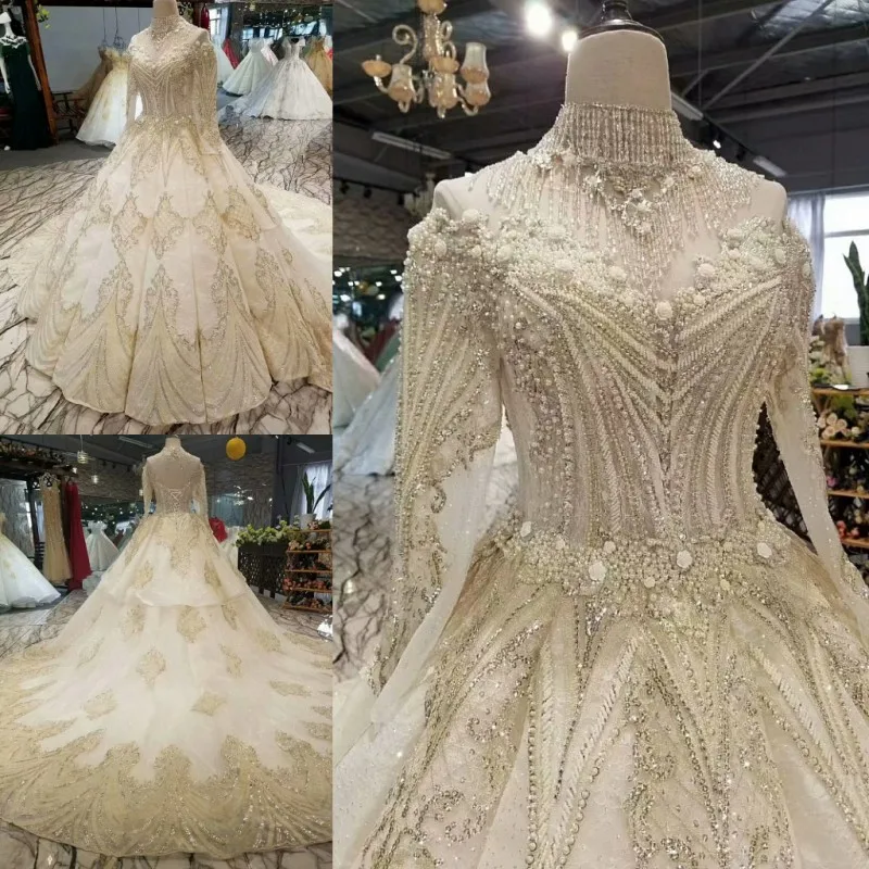 Real Photo vestido de noiva Ball Gown Lace Sequins Crystal Full Sleeves Wedding Dresses 2021 QUEEN BRIDAL robe de mariee WD72