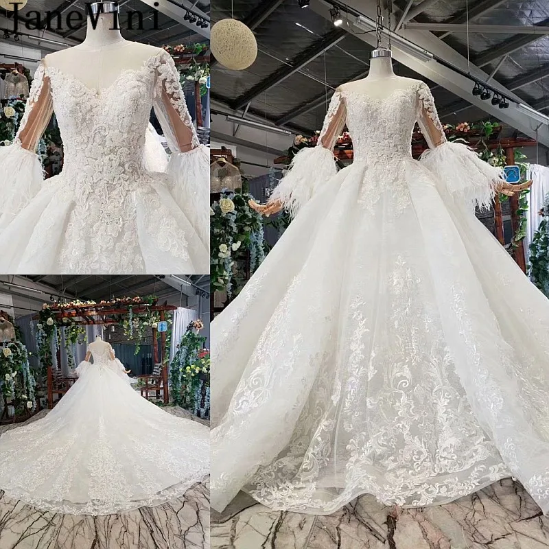JaneVini Dubai Beaded Wedding Dress Feathers Long Sleeves Lace Pearls Ball Gown Bridal Dresses Luxury African Wedding Gowns 2020
