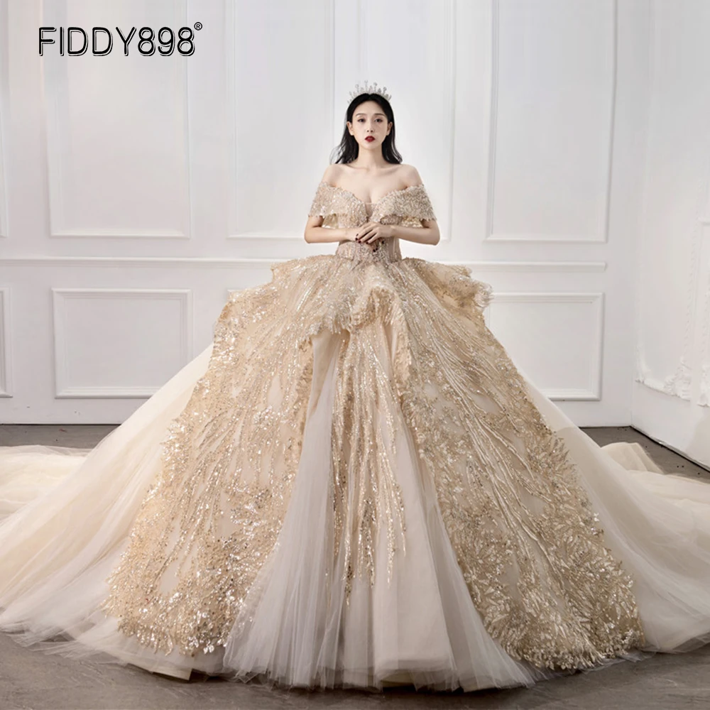 Golden Dubai Ball Gown Wedding Dress Off-shoulder Bride Dress Luxury Sequins Long Train Beaded Wedding Dresses for Women 2020