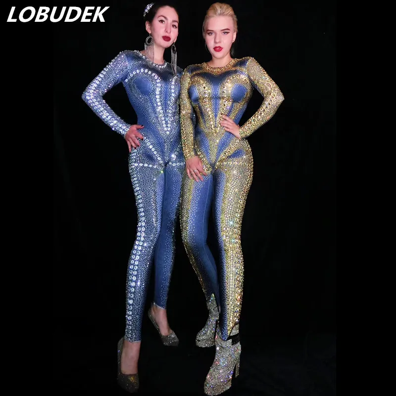 Buy Gold Silver Rhinestones Blue Denim Printed Jumpsuit Elastic Crystals Skinny Jumpsuits Lady Birthday Stage Wear Nightclub Costume and You will Save USD 0 or 0%, Because You Just Pay for 106.00 not Full Price for 106.00