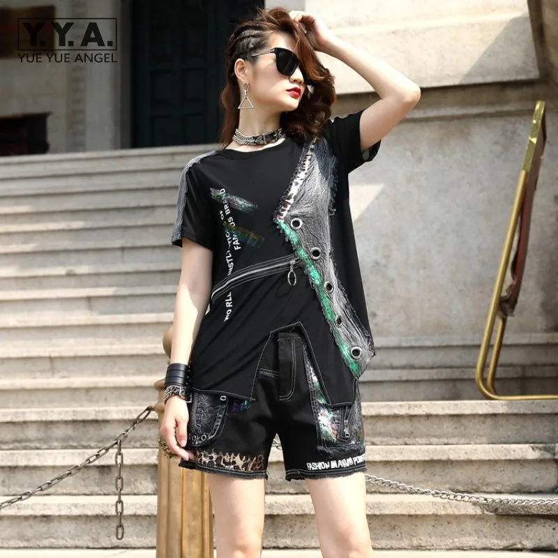 Related Product for and Women 2 Piece Sets Summer Asymmetrical Patchwork T-Shirts Tops Elastic High Waist Printed Leopard Shorts Female Streetwear Sets